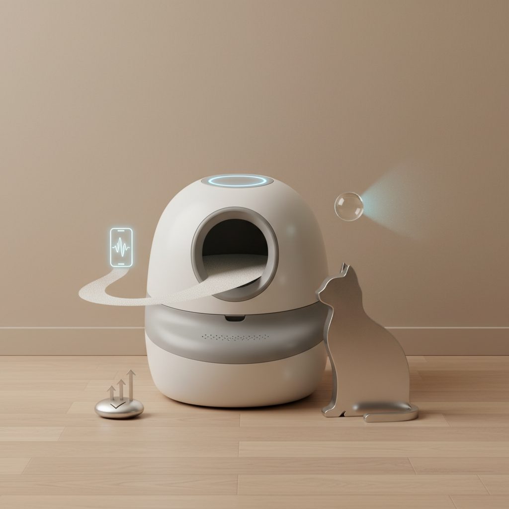 - Judėjimo ar svorio sensoriai. Jie nustato, kada katė įeina ar išeina iš tualeto, kad valymo ciklas prasidėtų tik tada, kai tai yra saugu.