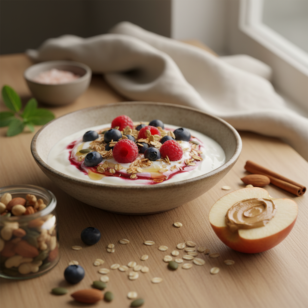 - Natūralus jogurtas – puikus baltymų, probiotikų ir kalcio šaltinis.