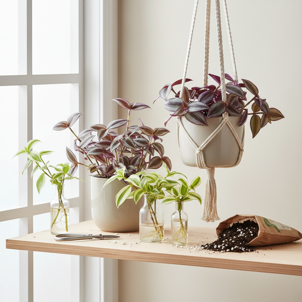 - Tradescantia pallida – tamsiai violetinė, beveik juoda, kuri sukuria egzotišką kontrastą interjere.